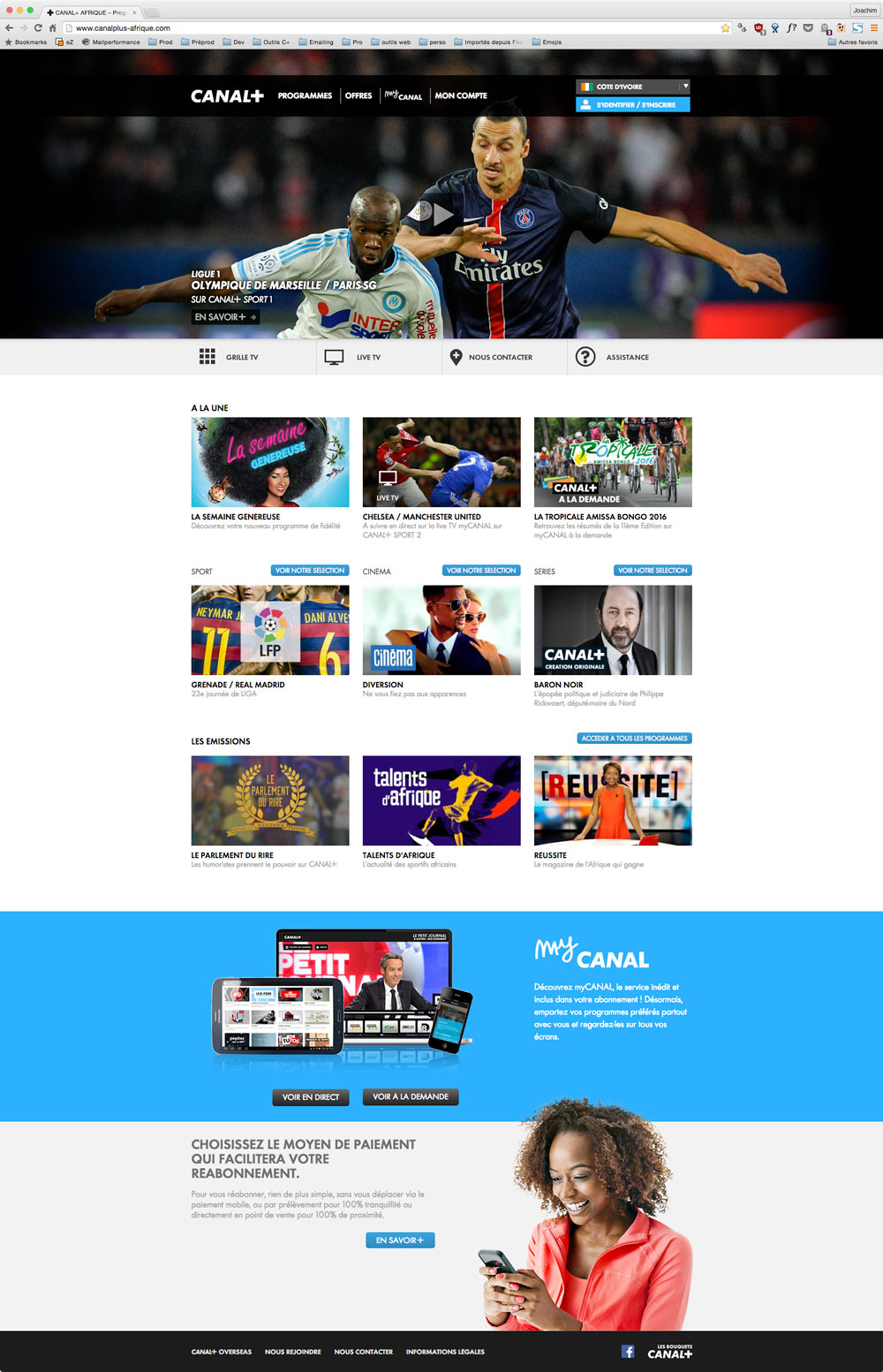 Au cours de ma mission dans l'équipe web de CANAL+ Overseas, j'ai pu travailler sur la refonte complète des sites. En proposant une nouvelle homepage mettant en avant les visuels programme, il a fallu concevoir toutes les pages intérieures : programmes, offres, selfcare. L'UX des sites a été complètement repensée, en restant en lien avec l'identité très forte du groupe CANAL+.