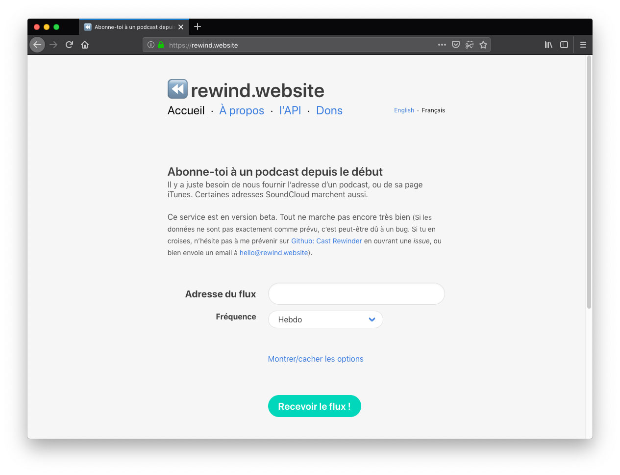 Cast Rewinder est une webapp qui répond à un besoin que j'avais : quand on s’intéresse aux podcasts, on en découvre parfois un qu’on aimerait commencer depuis le début… l’idée est de pouvoir s’y abonner et recevoir les plus anciens épisodes d’abord, à intervalle prédéfini. J’ai codé cette webapp en Python, en utilisant le framework Flask et l'ORM SQLAlchemy, l'intégration repose en partie sur le framework CSS Bulma.